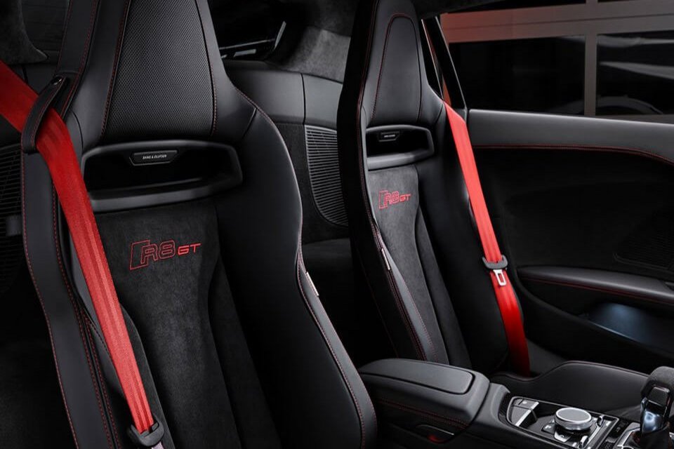 The Audi R8's striking design is down to the forward position of the cab, the strongly accentuated wheelhouses and the sporty diffuser. The Audio R8 Coupe V10 Performance Quattro has built-in RECARO shell seats. Covers for the interior come in leather or Alcantara® as standard with the option of colorful highlights in Mercato Blue and glossy carbon trim. The RECARO shell seats can also be added to the Audi R8 (Standard) if desired.