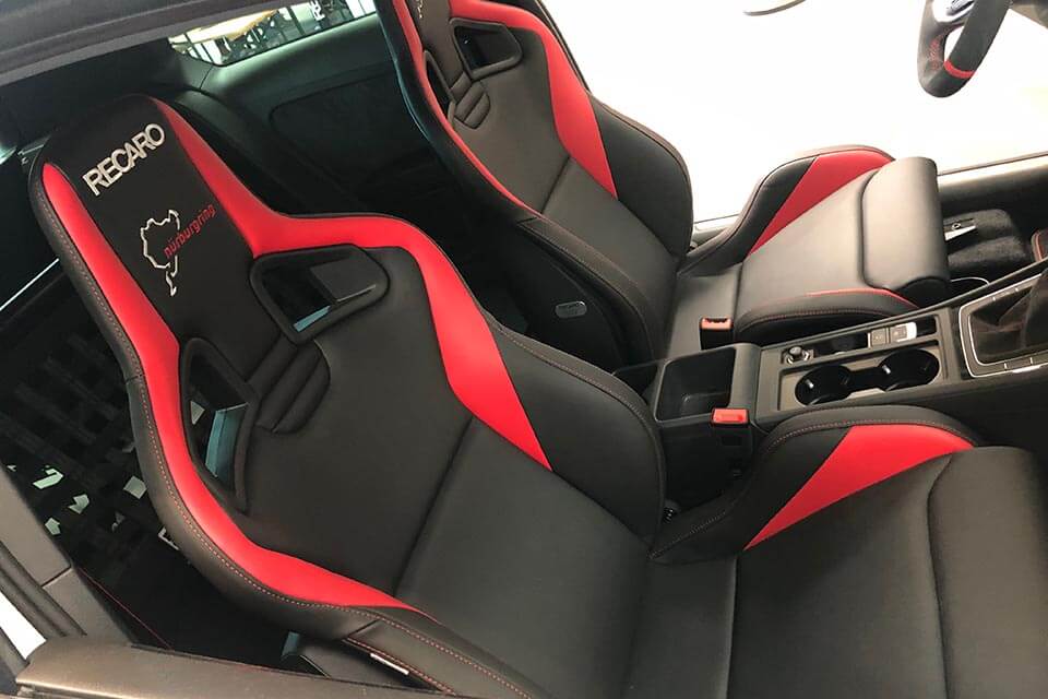 Feature highlights: Exclusive Nürburgring and RECARO branding, edition tag with custom number, premium-quality black leather seat upholstery, handmade decorative stitching, accent stripes on back shell, pronounced lateral support in backrest and specially formed and optimized shoulder support.
